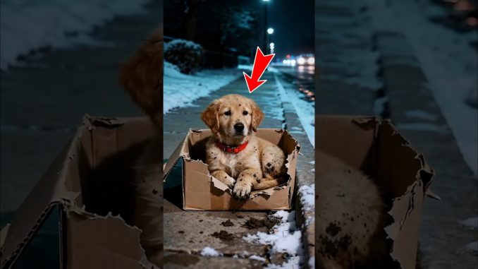The film opens on a quiet, snow-covered street where a small Golden Retriever puppy sits curled inside a worn cardboard box. The bright red collar around its neck hints at a past life—perhaps a home it once had—but now it faces the world alone. Snowflakes drift down, settling on the pavement and the lid of the box, emphasizing the biting cold that surrounds the vulnerable puppy.