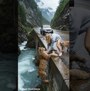 It was a quiet afternoon on a winding mountain road when nature and courage collided in the most unexpected way. A young woman, out for a scenic drive, came across an incredible sight — an adult lynx trapped on the edge of a narrow bridge, dangerously close to falling into a fast-moving river below.