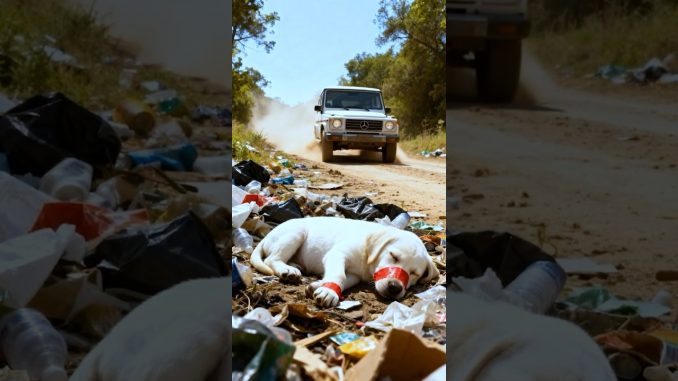 The video begins with a small white puppy left alone near a pile of roadside trash. The dog appears frightened, confused, and unable to move properly. Its vulnerable state immediately conveys that it has been through a difficult experience.
