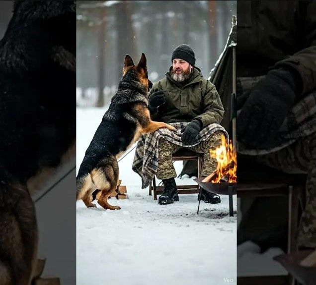 Not far away, a man and his loyal German Shepherd were enjoying their daily walk. The dog was full of life, exploring the snowy path with bright eyes and energetic steps. But as they approached the park bench, the dog suddenly stopped. Its ears perked up, tail lowered, and its attention locked onto the elderly woman.