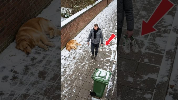 The video opens on a peaceful, snow-dusted street. A young man, likely a passerby or resident of the area, is seen tossing a clean pair of white sneakers into a nearby waste bin. Sitting only a few steps away is a calm Golden Retriever, its golden coat glowing softly against the wintry backdrop. The dog watches the man walk away, then approaches the bin with noticeable curiosity.