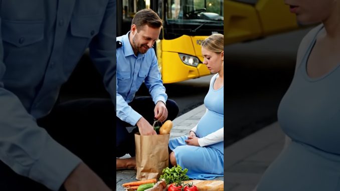 The story begins with an ordinary scene on a rainy city street. A pregnant woman, carrying a brown paper bag filled with groceries, approaches a bus stop. Balancing her heavy load while trying to protect her belongings from the drizzle, she steps toward the bus as it arrives. But just as she tries to climb aboard, her foot slips on the wet pavement. She falls onto the sidewalk, and her groceries spill out—bread, vegetables, fruit—rolling across the damp ground.