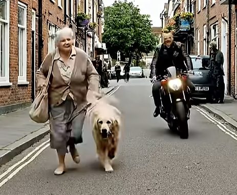 One of the most memorable elements of the short film is the dog’s quick thinking. Instead of confronting the rider, the retriever discovers a simple obstacle—a discarded rope near a lamppost. The dog interacts with it in a way that gently slows the motorcyclist upon his return, bringing the dramatic chase to a safe and sudden end.