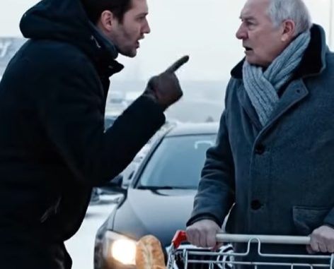 The elderly man, startled, tries to adjust himself, but the driver exits the car, pushes the heavy cart aside with unnecessary force, and continues on his way. The impact causes the older man to lose balance and fall onto the soft layer of snow, his groceries scattering across the ground.