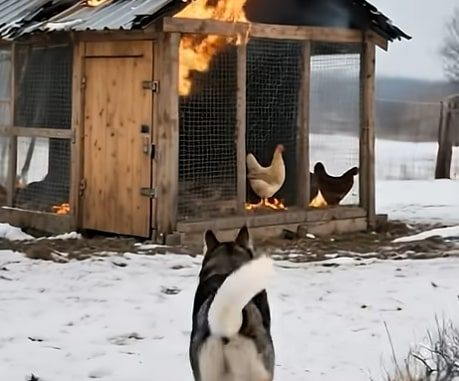 A cold winter morning on a quiet farm quickly turned into a potentially dangerous situation when a wooden chicken coop unexpectedly caught fire. The dry straw and old wood fueled the flames quickly, filling the snowy farmyard with smoke. Dozens of chickens inside the coop became frightened and confused as the heat and smoke grew stronger. But just when things looked serious, a loyal Husky stepped up in a remarkable way.