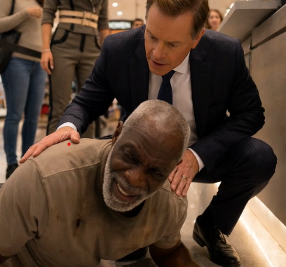 The elderly man hit the marble floor hard—his body absorbing the impact with a heavy thud that echoed under the bright LED lights. His hands trembled as he tried to steady himself, breath knocked out for a moment.
