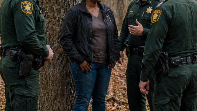 By the time the first figures emerged between the trees—dark suits, weapons low but ready—the three cops were already backing away like men who had finally understood the scale of their mistake.