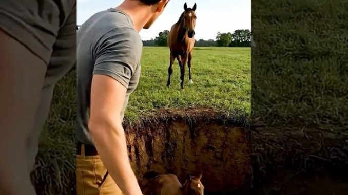 He walked behind her through tall grass, the mare stopping every few seconds to ensure he stayed close. She then approached a shallow ditch near an old wooden fence. That’s when the man saw the source of her distress: a tiny foal, lying on its side, its small leg wedged tightly between branches and soft, sticky mud. The baby horse trembled weakly, unable to stand or call loudly enough for help.