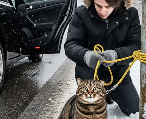 Seventy-five-year-old Mr. Harris, known affectionately by neighbors as “Grandfather,” was driving slowly along the frosty road when something unusual caught his eye. Near a wooden pole, almost buried in snow, sat a small striped cat. At first, he thought it might simply be resting, but as he looked closer, he noticed the cat was trembling — and tied with a small rope.