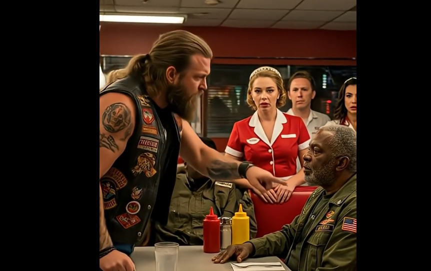 But the biker wasn’t done. He approached the table with an exaggerated smirk and said something meant to belittle the elderly man. The diner grew tense. Forks paused mid-air. Even the radio seemed to quiet down.