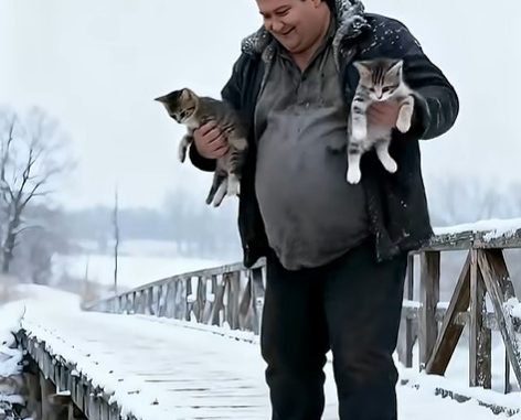 The story opens with a sweeping shot of a snow-covered wooden bridge stretching across a fast-moving river. Despite the picturesque surroundings, the danger becomes clear as the camera focuses on three tiny kittens clinging tightly to a small branch just above the rushing water. The current crashes around them, icy and relentless, as the kittens meow for help. Their wet fur and trembling bodies highlight the urgency of the moment.