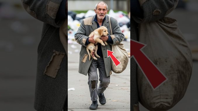While digging through the debris, he makes a heartbreaking discovery: a small Golden Retriever puppy left inside a cardboard box. Weak, injured, and trembling, the puppy lifts its head as the man approaches. Without hesitation, the elderly man gently scoops the little dog into his arms and carries it away from the rubble, choosing compassion over his own difficult circumstances.