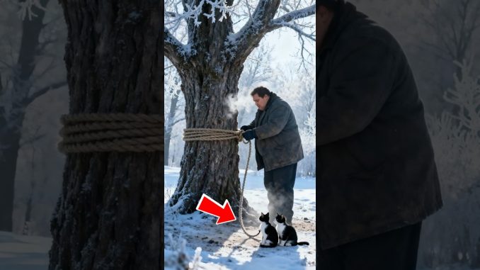 The video opens with a hard-to-watch moment as two tiny black-and-white kittens are left tied to the base of a tree while a heavy snow begins to fall. As the wind grows stronger and temperatures drop, the kittens cling to each other for warmth, their small bodies trembling. The snow quickly begins to blanket their fur as they wait helplessly in the icy storm.