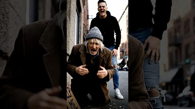 The video begins on a quiet sidewalk, where an elderly man sits with a small sign asking for help. His belongings are modest: a bowl for donations, a few personal items, and a weary expression. He appears vulnerable, yet hopeful.