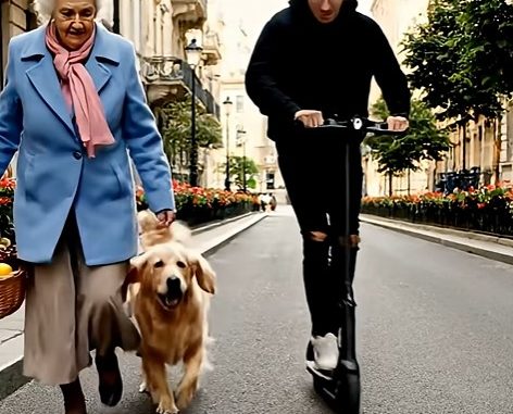 The video begins with an elderly woman walking peacefully with her Golden Retriever at her side. At that same moment, a young man rides through the street on an e-scooter, distracted and moving too quickly. As he turns a corner, he accidentally bumps into the woman, causing her to lose her balance and fall to the ground. Her basket tips, scattering fruit across the pavement.