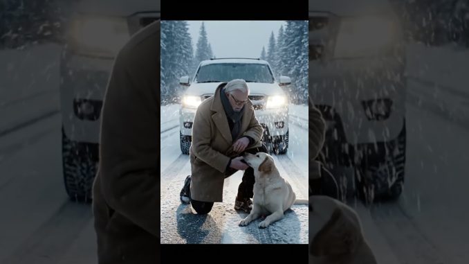 A white pickup truck approaches and slows to a carefully controlled stop just a few feet away. From it emerges an older man bundled in warm winter clothing. Concerned by the sight of the dog resting on the road, he approaches slowly and kneels down, offering comforting words and gentle pats. The dog, sensing kindness, immediately relaxes. Without hesitation, the man scoops the dog into his arms, ensuring its safety and warmth.